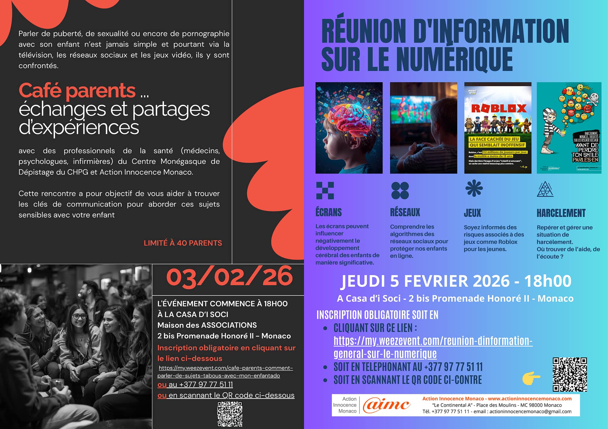 Dans le cadre de sa mission de protection des enfants en ligne et d’accompagnement des familles, Action Innocence Monaco (AIMC) organise deux événements à destination des parents en février 2026 à Monaco.